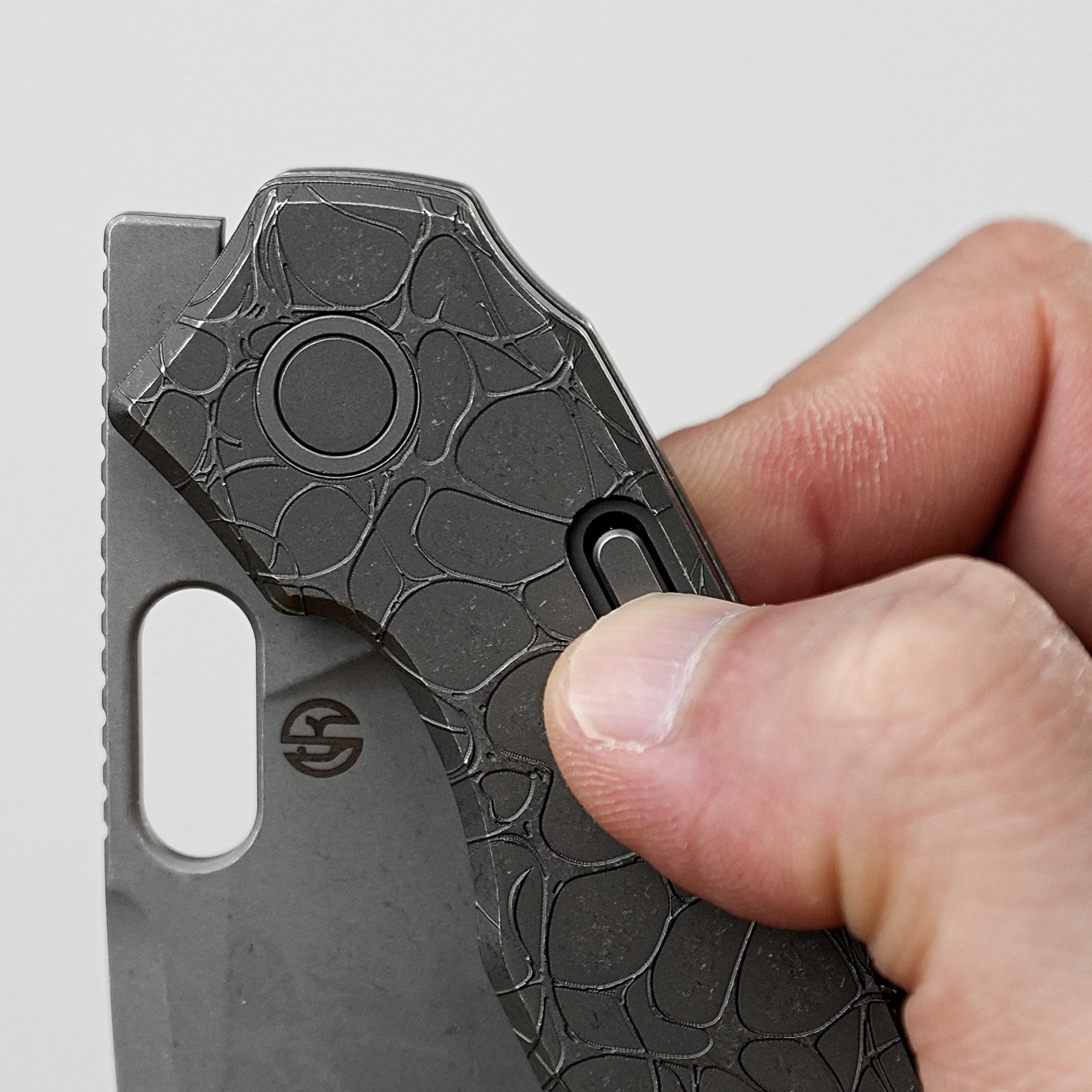 The Psyop features a button-operated Top-liner lock and the oval-shaped button is easy to access and fits the overall knife style seamlessly. Equipped with a ceramic ball-bearing system, the Psyop can be deployed with both a front flipper and thumbhole.