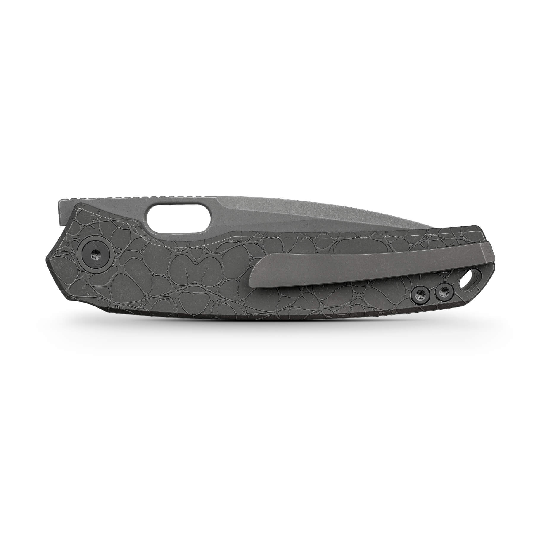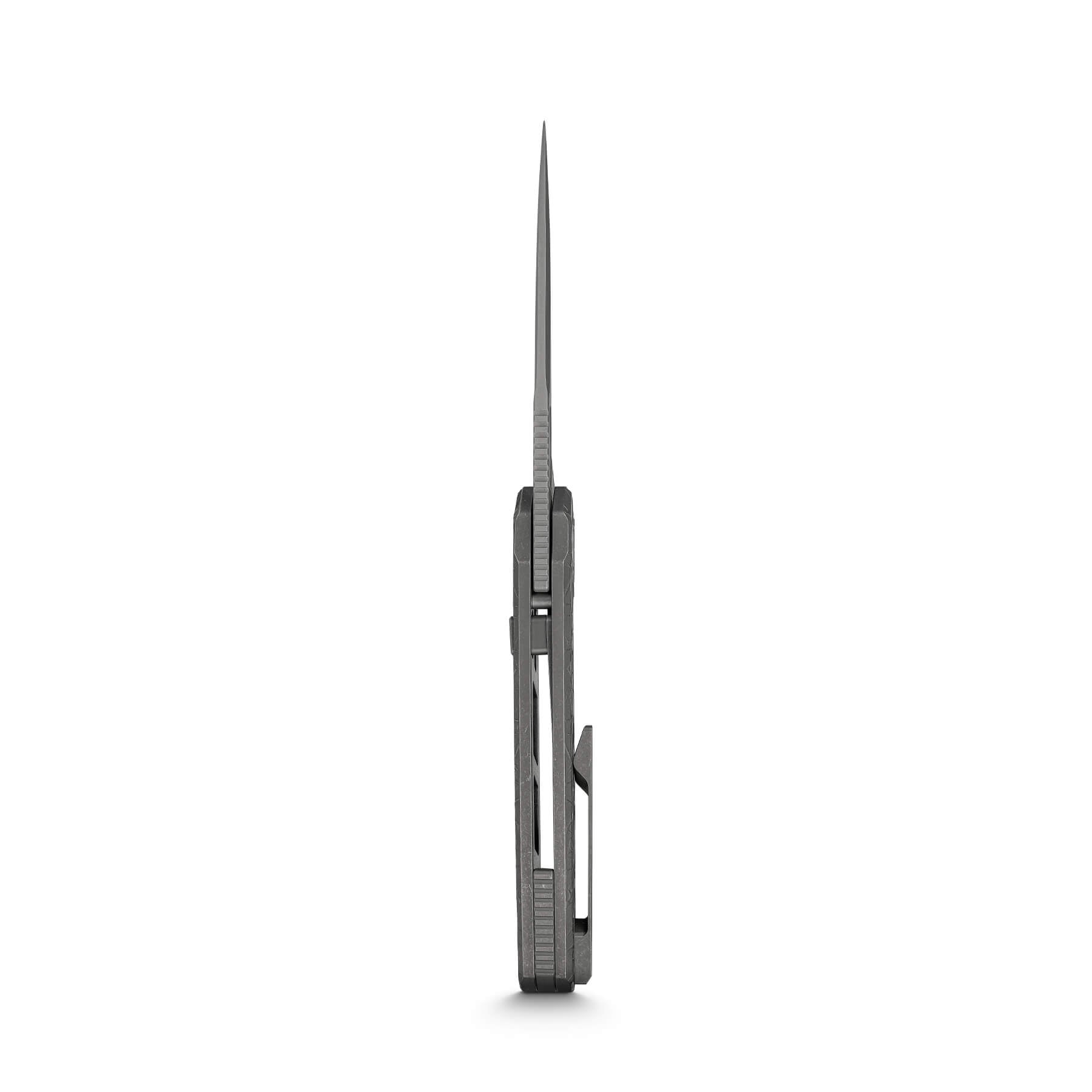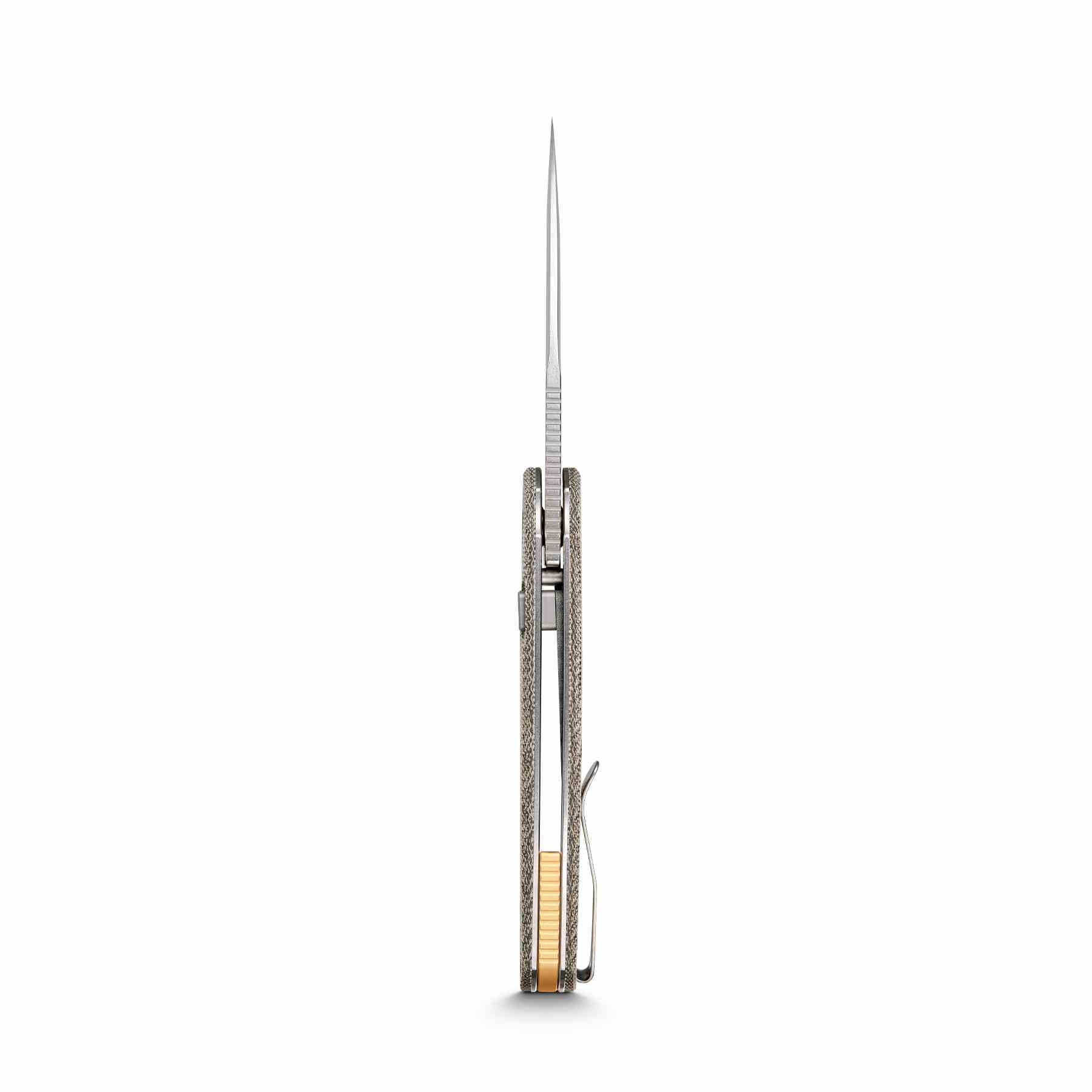 Titanium version feature 3D milled, non-reversible pocket clip that is fixed onto the handle with hidden screw sets. Micarta version feature reversible, deep carry pocket clip.
