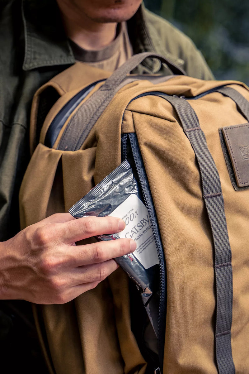 Hidden side pocket zippers open towards the back and are concealed within pleats, making it perfect for storing an umbrella or a 500ml water bottle. From the front, the pockets are entirely invisible, offering both theft protection and a sleek appearance. Additionally, the side pockets expand outward, ensuring they don't take up any internal space.