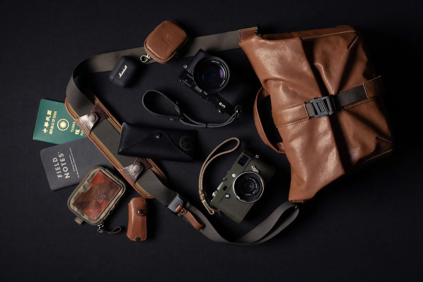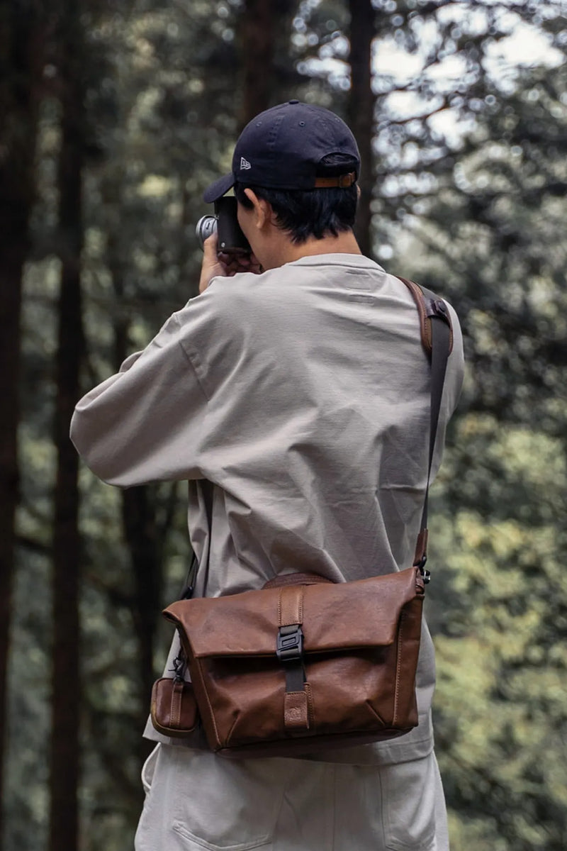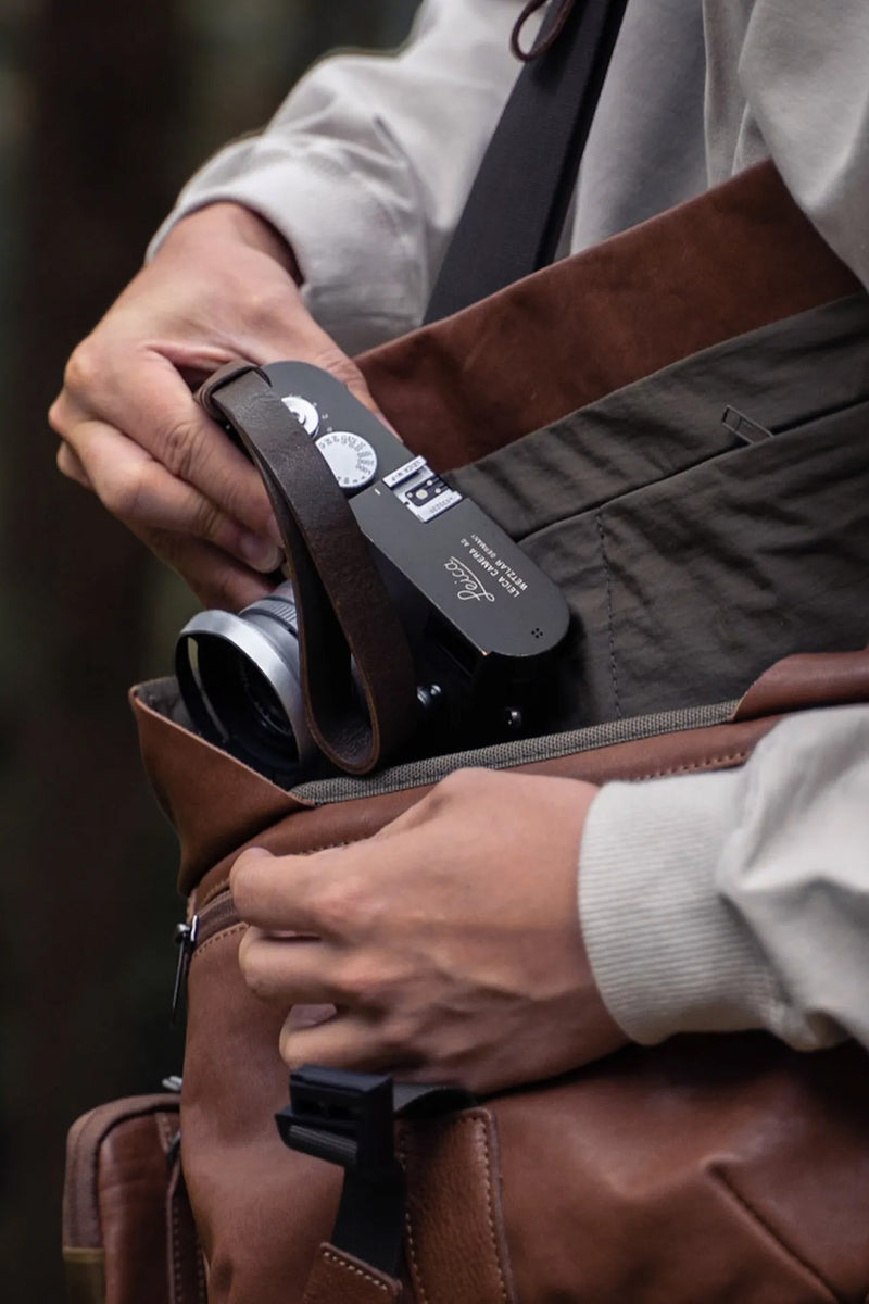 It comes with the same standard features as the canvas version Pilot, including the Fidlock magnetic buckle and quick-adjusting shoulder strap. The body of the bag is predominantly made of Italian leather, with the leather's interior fibers rich in oil, which gradually emerges on the surface as it's used, adding a mature and distinctive flavor.