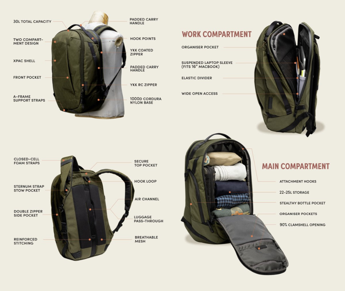 The Max isn't a black-hole stuff sack; it's designed for everyday use, and that means proper organisation – work compartments, padded laptop sleeve, protective pockets – that lets you arrange your gear just how you like it. The laptop sleeve is raised off the bag floor for drop protection and the dividers make it easy to sort your work stuff. See the details in the below images and video.