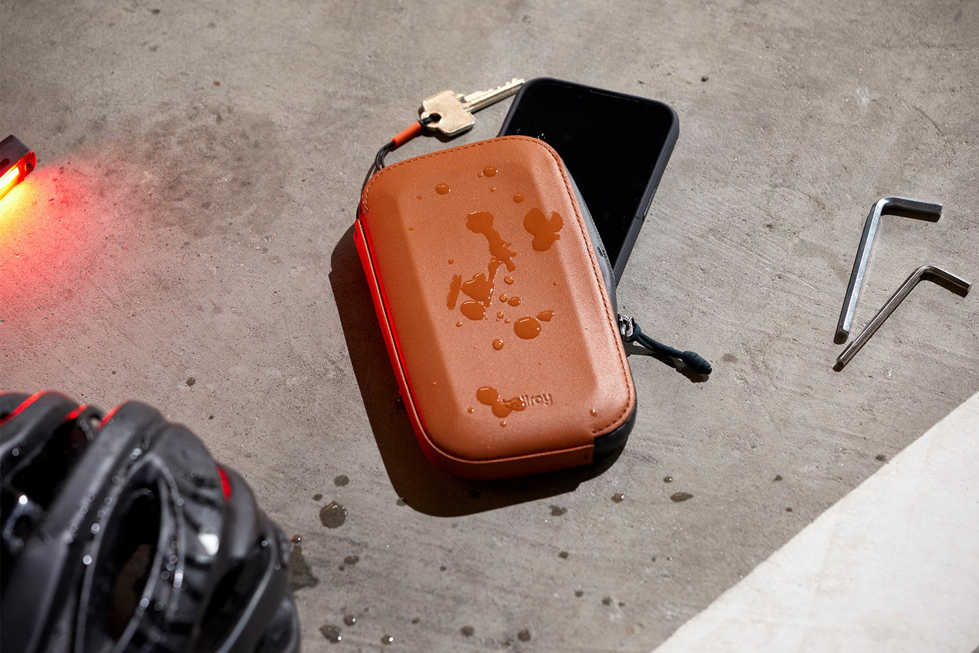 The pre-molded leather shell is adopted from the Bellroy Apex wallets. The stretch mesh inside is an homage to cycling jerseys. And the subtle technical details (heat transfer logo, foil emboss) come from cycling brands.