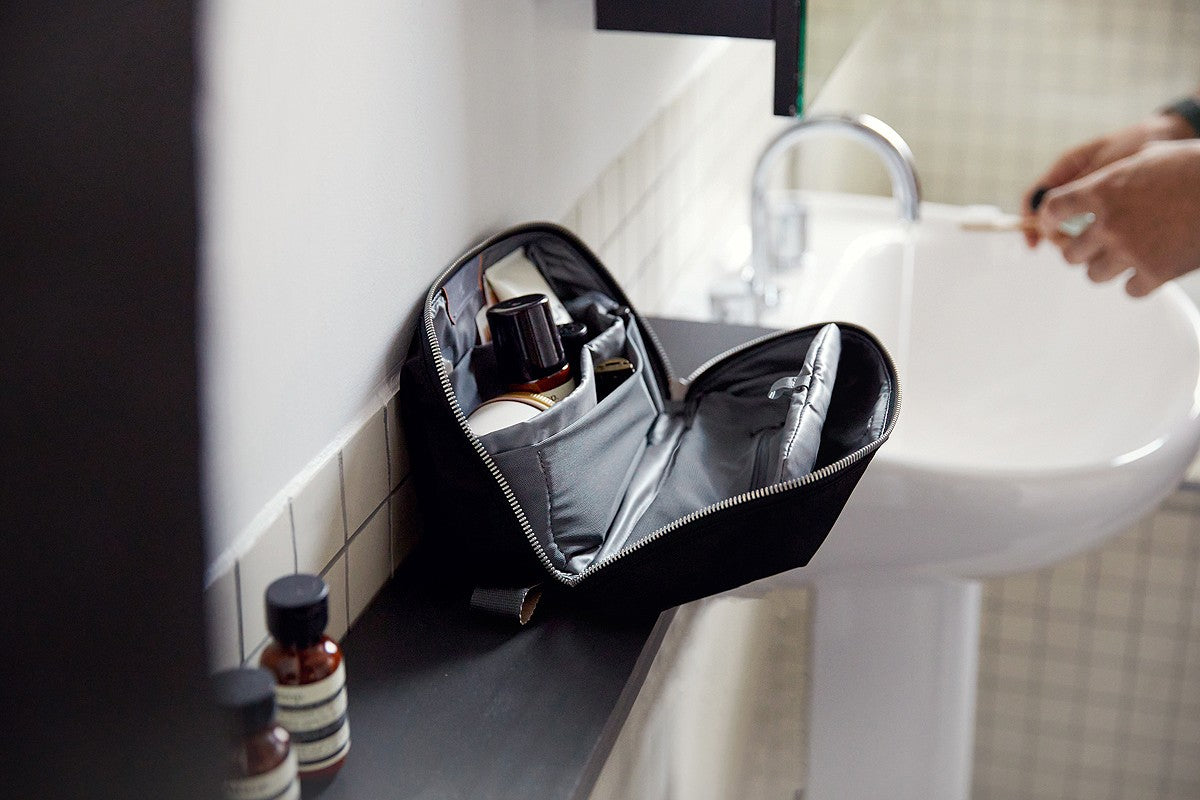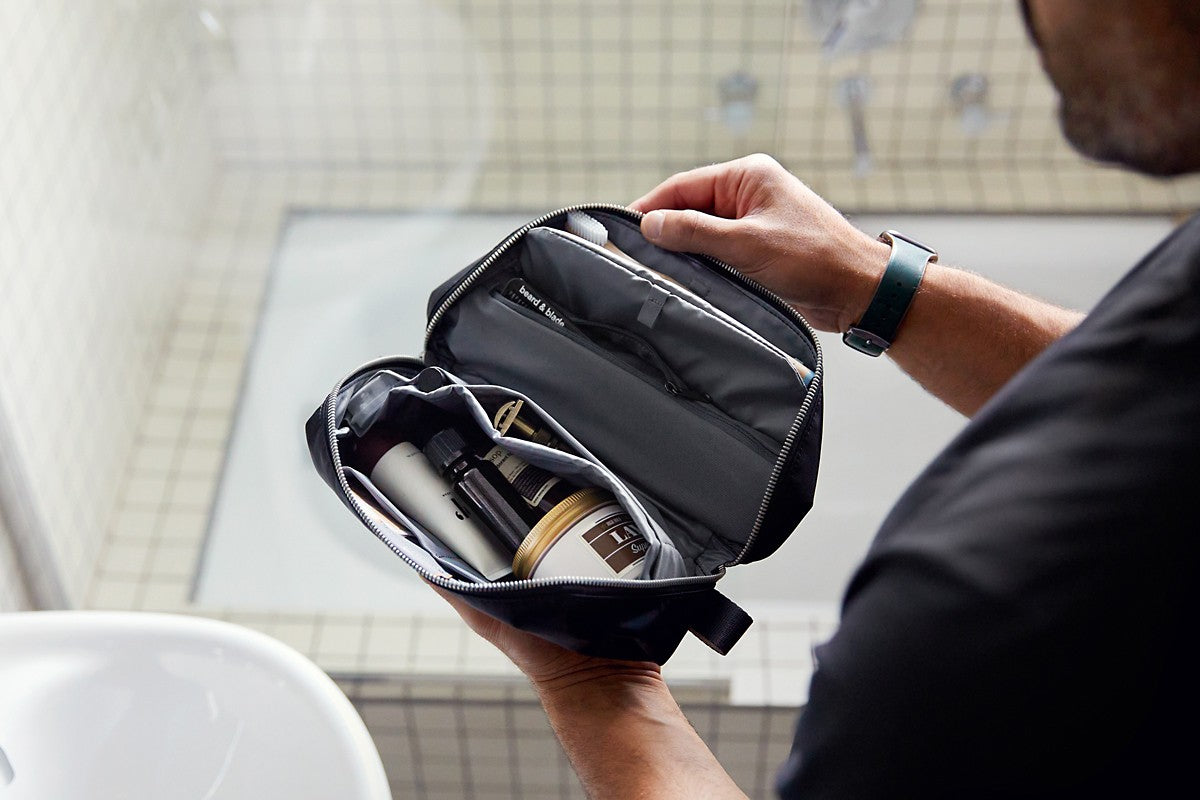 This kit has large storage, intuitive organization and easy access to keep your bathroom essentials sorted at home or away. The zipper is angled so the kit opens up wide, like a briefcase, while keeping your stuff safely stowed. Multiple internal pockets keep your toiletries from becoming one big jumble, by intuitively separating them into different zones. A clever magnetic shelf keeps your regular or electric toothbrush at a safe distance from your clippers and creams.