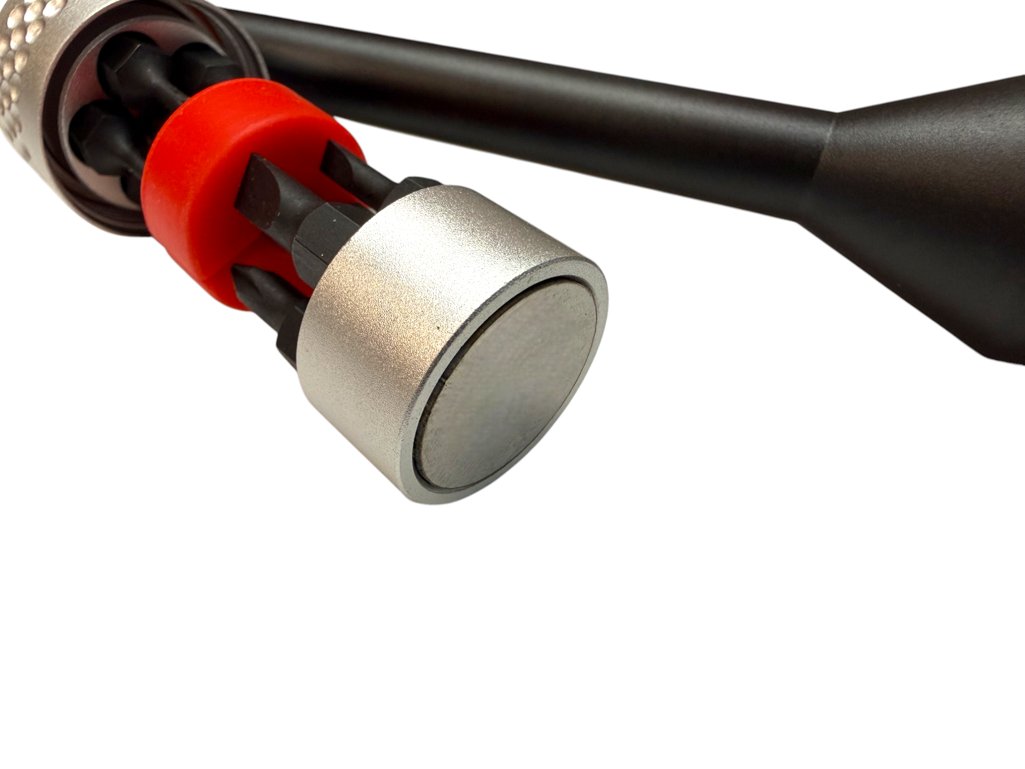 Non-slip golfball patterned handle provides 300% more gripping surface. Magnetic bit storage in the handle holds 10 included bits.