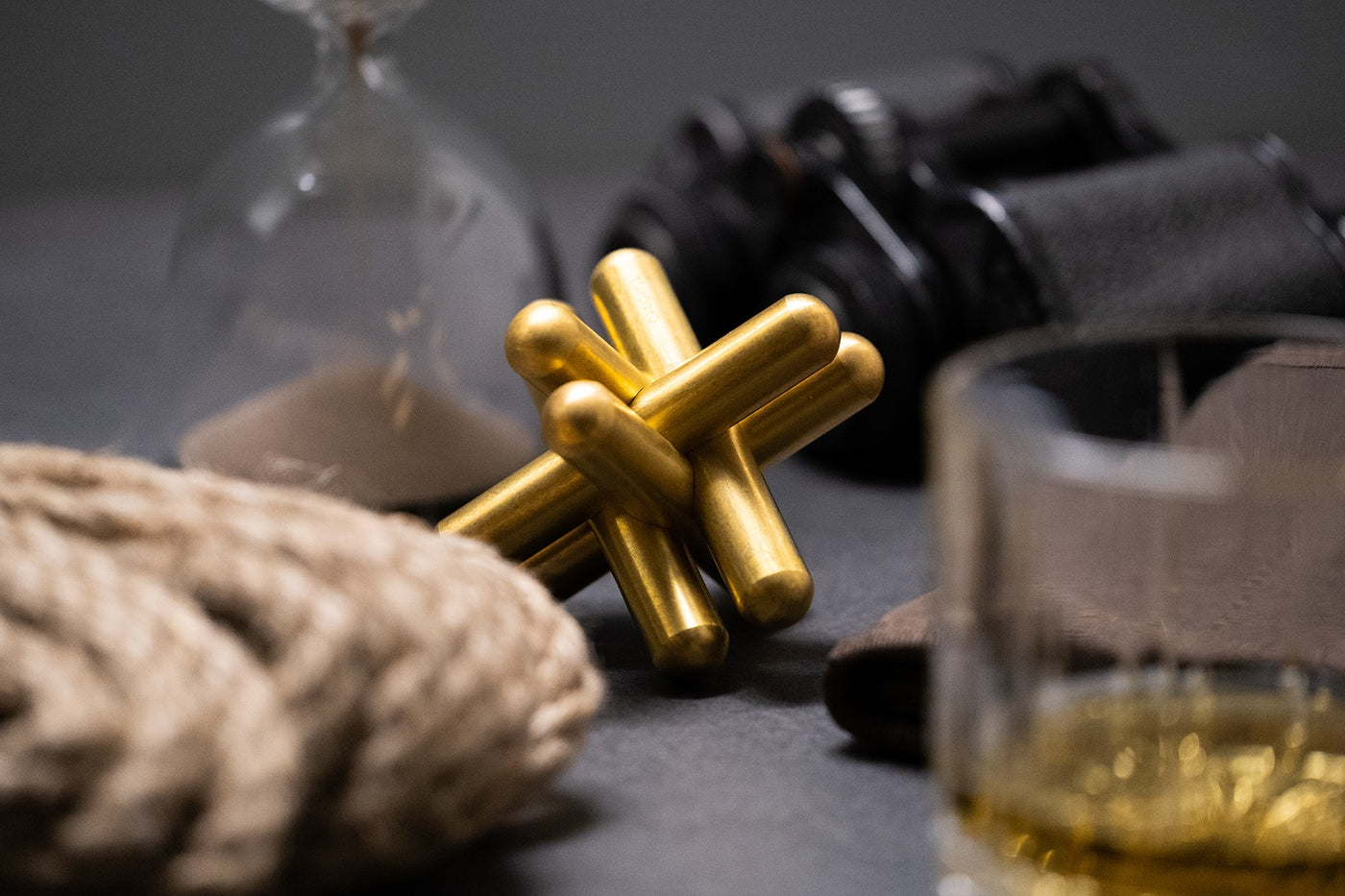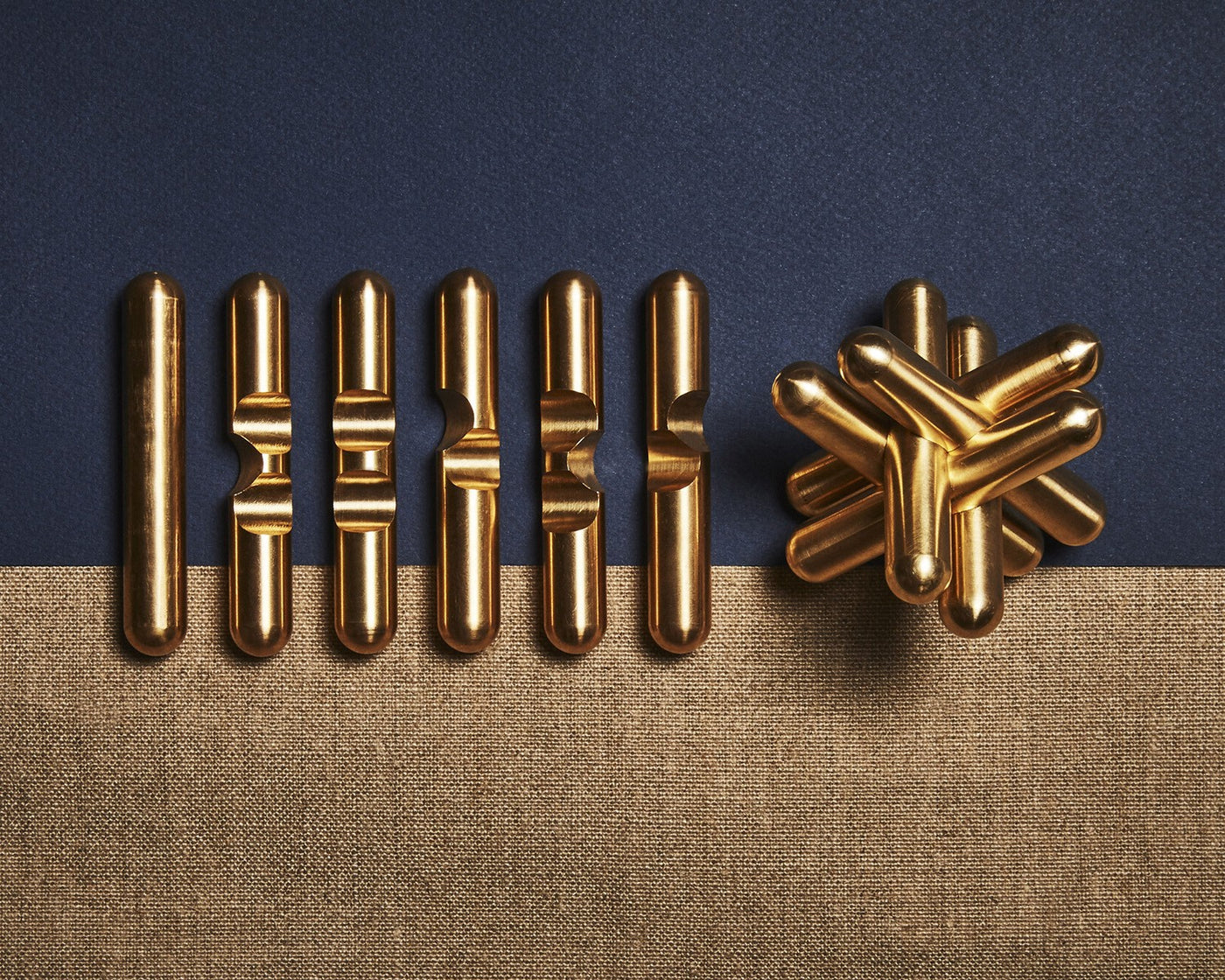 The Jack Puzzle consists of six different notched brass bars that interlock in one specific way to create a unified "jack" shape. It is milled by a skilled machinist, and weighs almost half kilogram. A desk object, a paperweight, and a true distraction. But be warned, if you take it apart, you might not be able to figure out how to put it back together…(Hand-drawn assembly instructions are included).