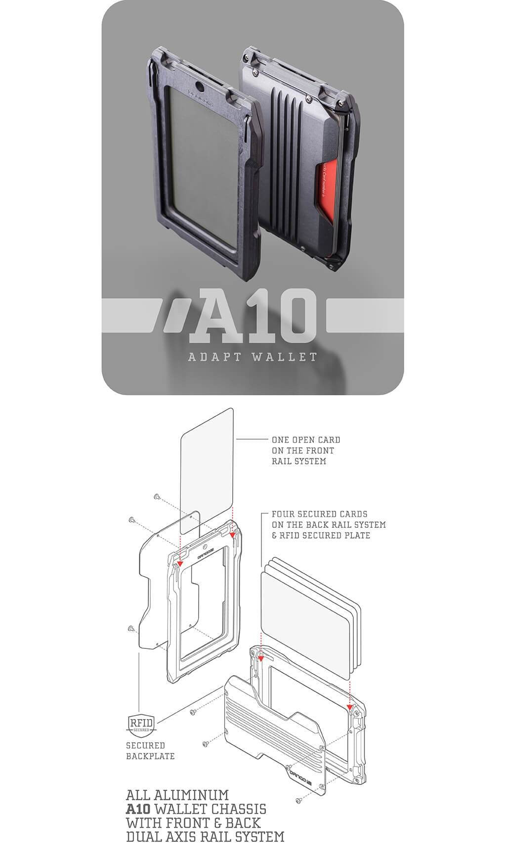The A10 Adapt Wallet is the basis of A10 series and it can be used by itself as a slim all aluminum wallet. You can also transform into a higher capacity wallet with the full range of separately sold pocket adapters (or ready-made configurations). It requires no tools to quickly adapt from one wallet to another - the adapters all share an innovative quick release sliding back-plate that swiftly glides along the A10’s rail system.