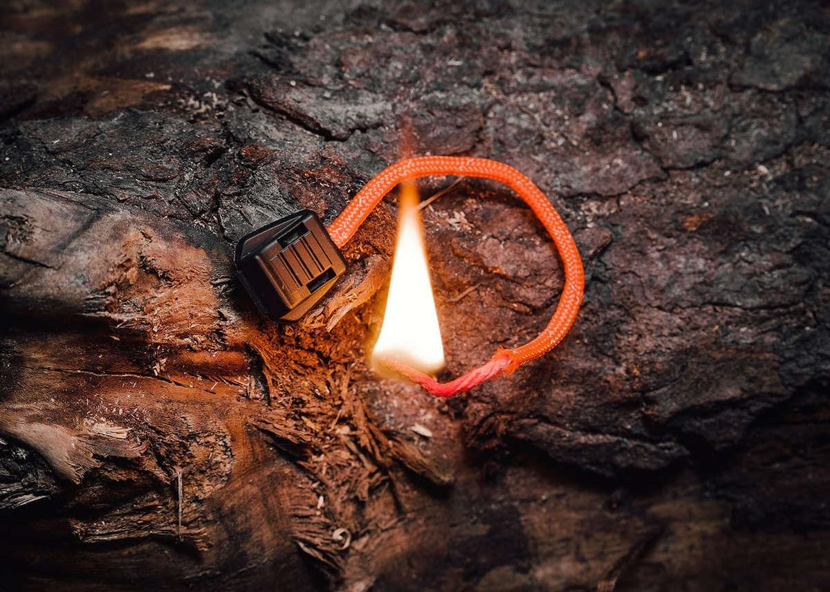 The red-treated core easily lights from a spark. Simply pull the core out and fluff the end with a knife before sparking. It can be lit from a ferrocerium rod such as nanoSTRIKER XL™ or a sparker such as the nanoSPARK™. Burns like a candle wick for approximately 1 minute.