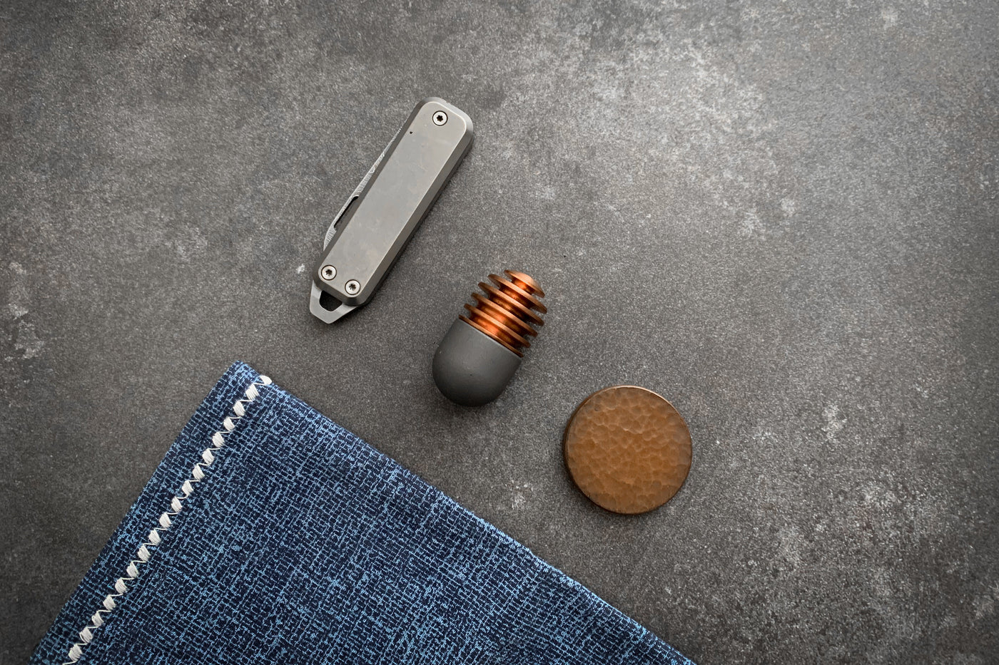 Stonewashed titanium bottom part, copper, titanium, brass or zirconium top part.