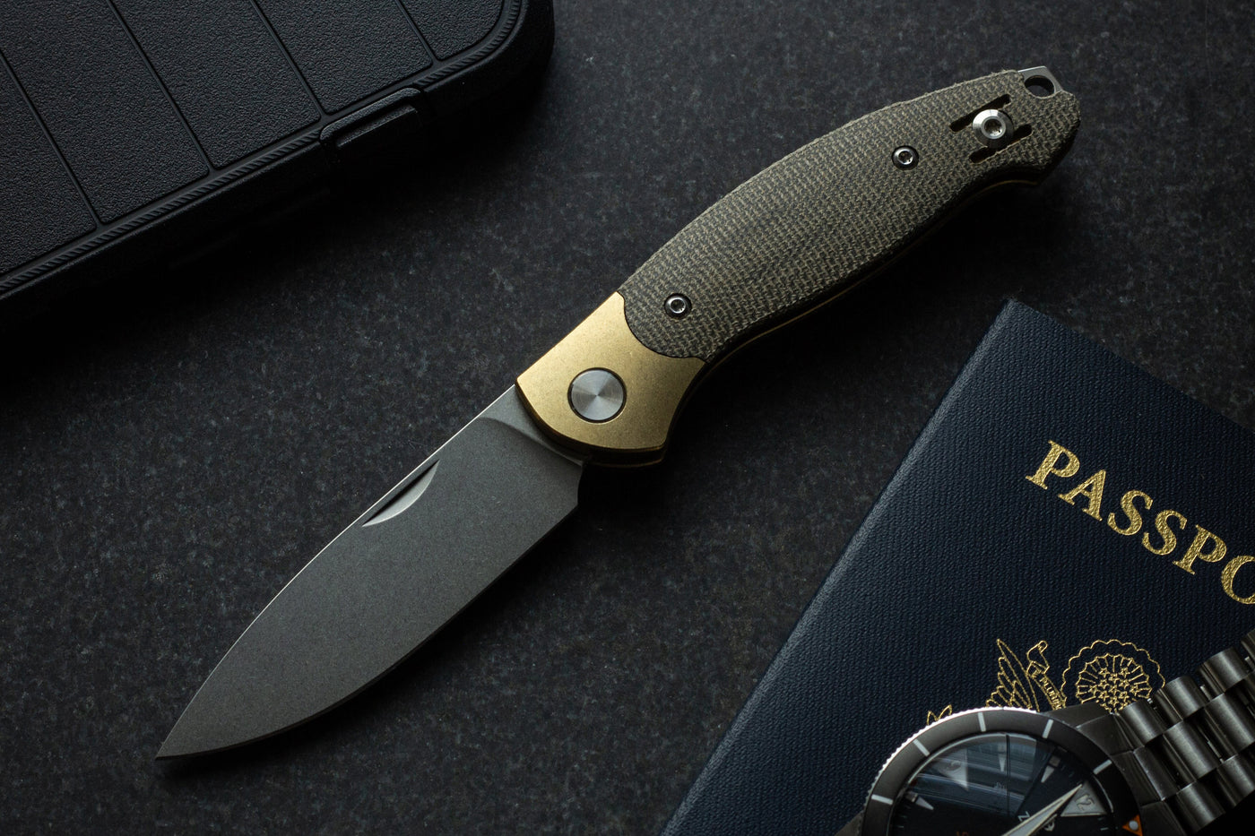 With rugged green canvas micarta scales, a brass bolster, and a matching brass liner, this Farley V2 exudes timeless character—gaining warmth and patina with every carry.