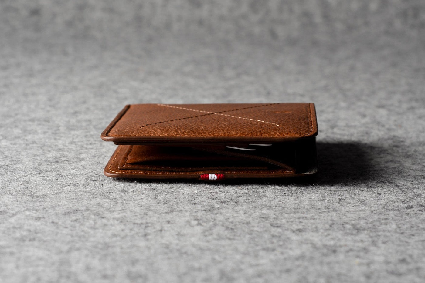 Manufactured from veg tanned leather, the Cash Card Wallet is made to survive your daily use. Open it for the first time and you'll hear a sound of new leather squeaks, waiting for being broken in by you. The wallet has 6 card slots for daily cards, backdropped with two hide-away slots for less frequently used cards. The cash compartment fits bills flat. It's quite a slim wallet which will fit neatly in your pocket.