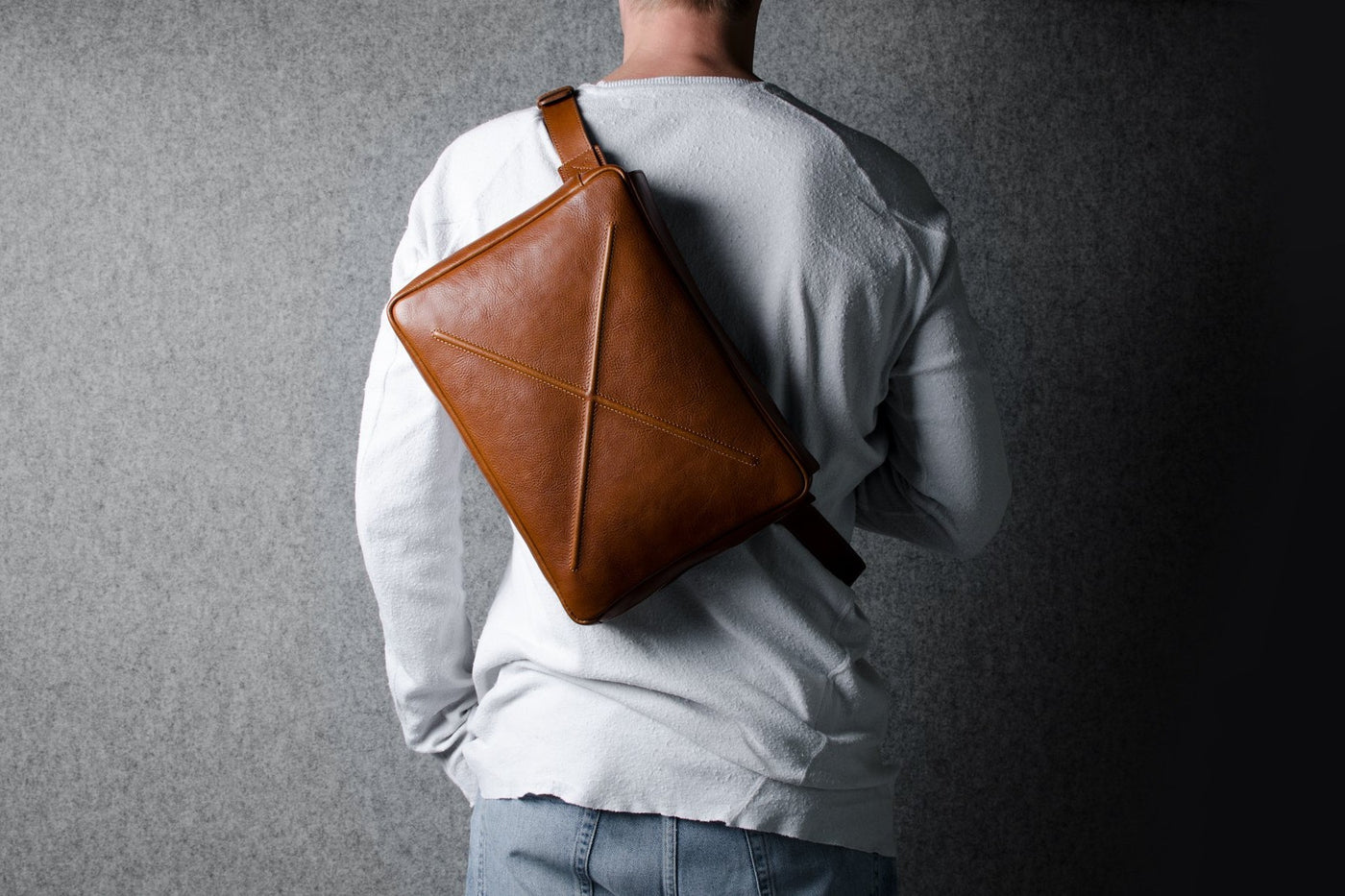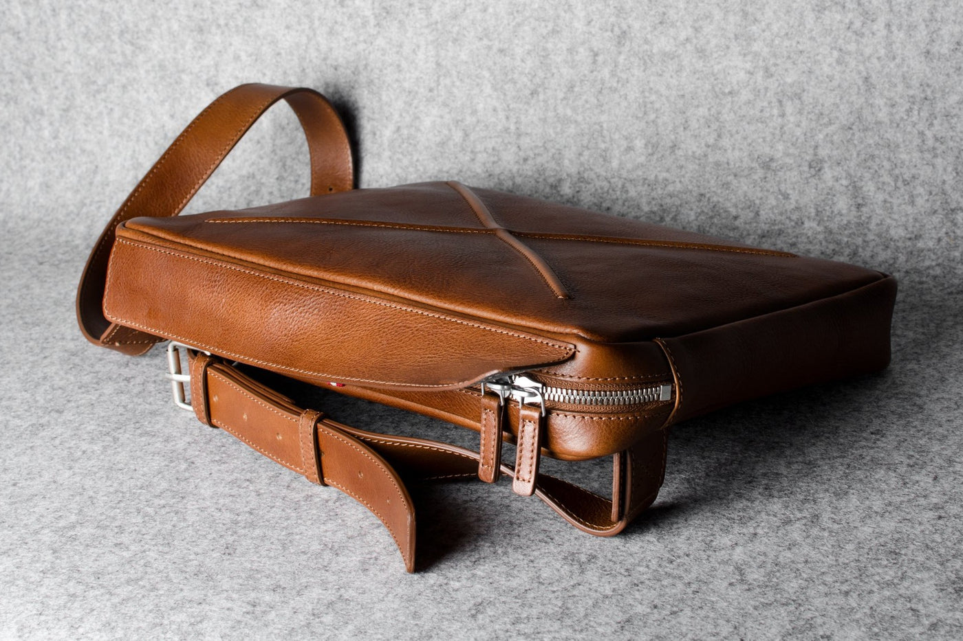 Made of rich veg tan leather, softly padded in all the right places. Lined internally with cotton you'll find one diagonal pocket to hold your laptop in place and one full width extra pocket on the inside front. The bag features an adjustable strap with metal buckle and a large corner zip opening so you have full access.