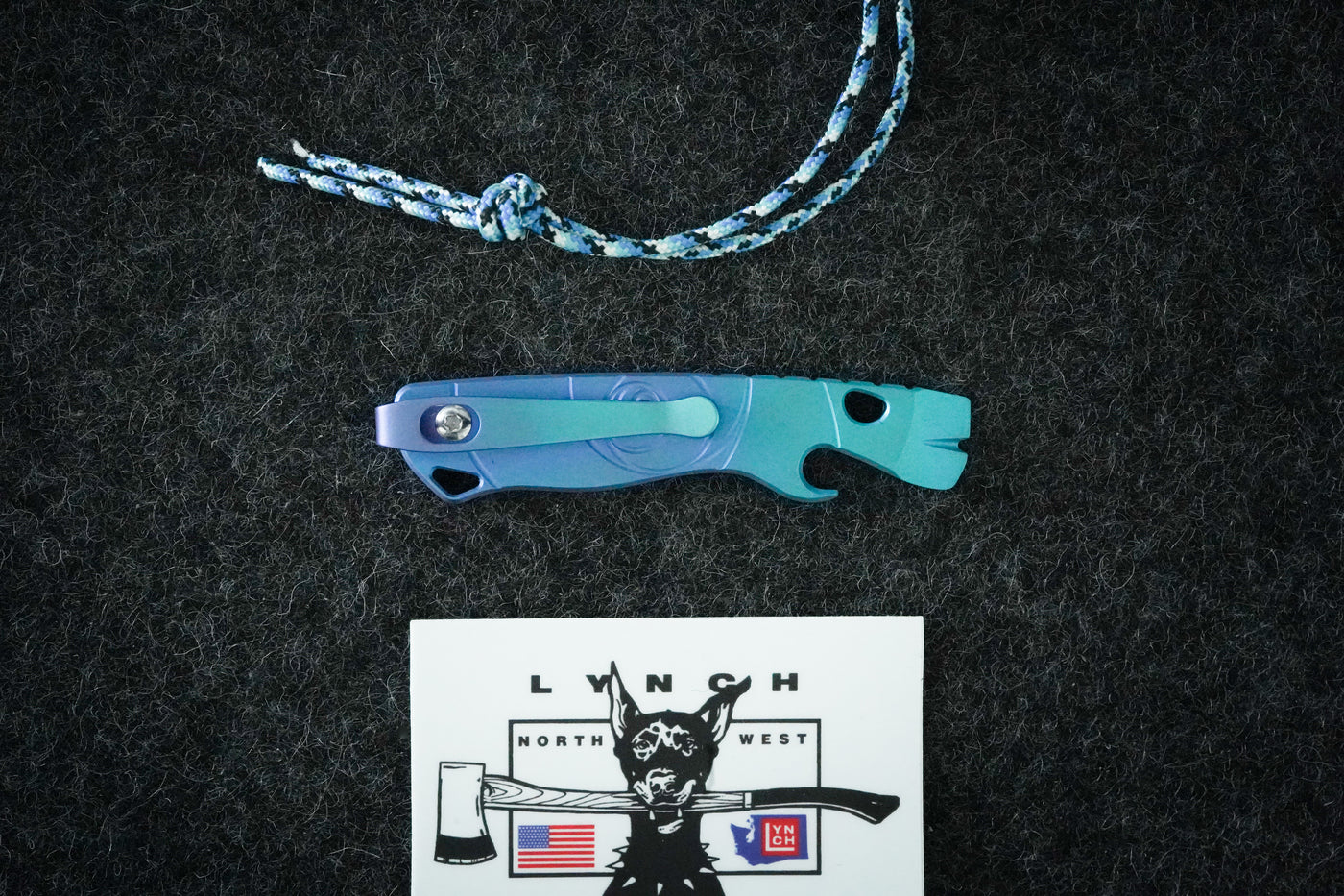 6AL-4V titanium, fully machined, with a titanium pocket clip. Each tool and clip is individually hand finished. CNC engraved Fibonacci artwork on front, with Fibonacci artwork and Feather engraving on opposite side. This prybar is shaped like the v2.5 prybar but the design artwork is all new.