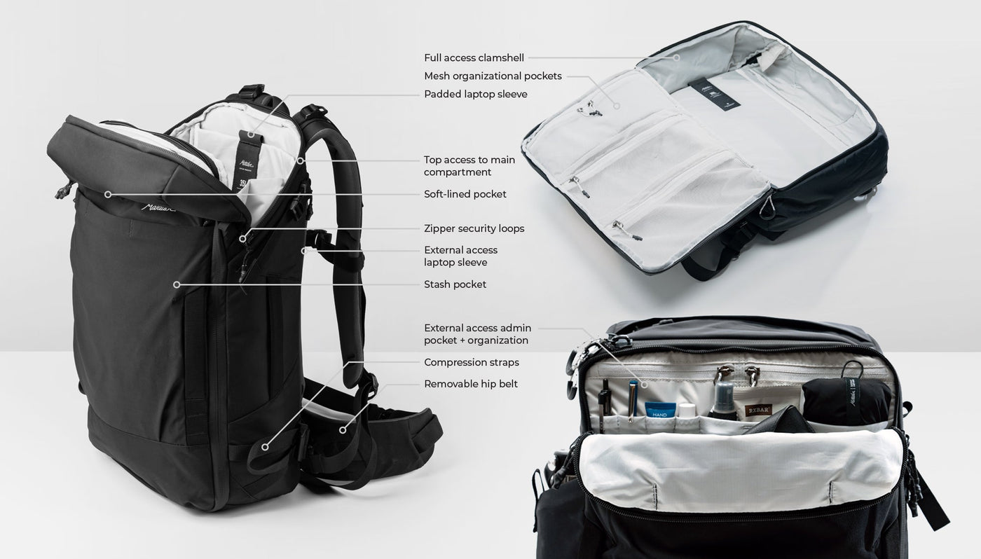 - Two main compartment entry points: clamshell access and top-loading access