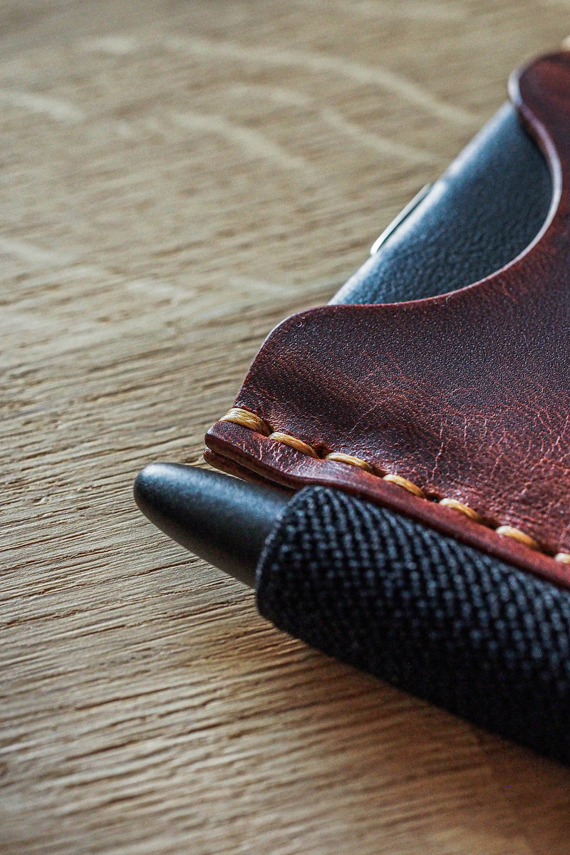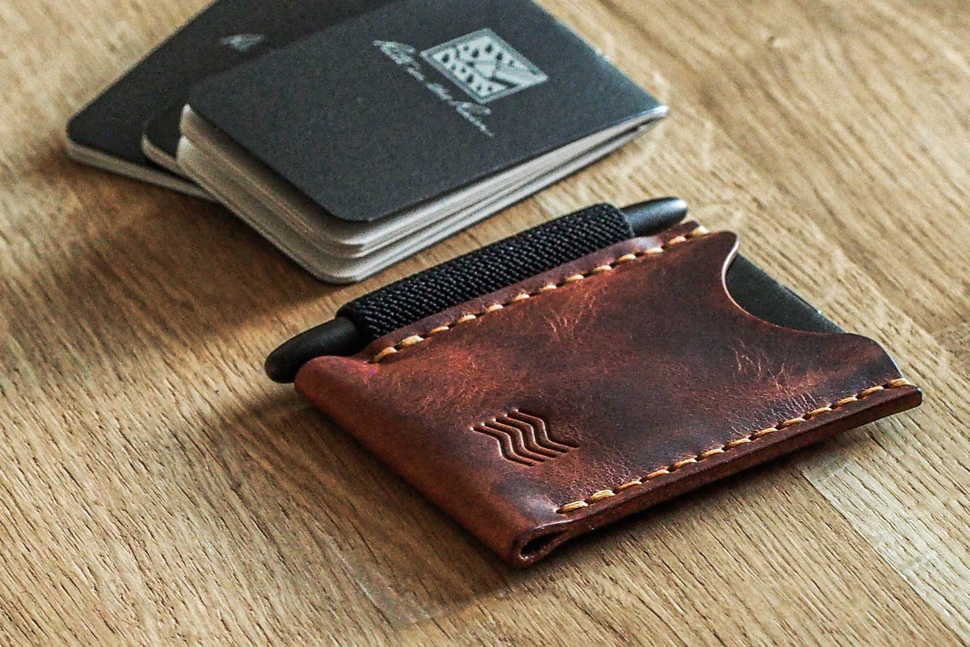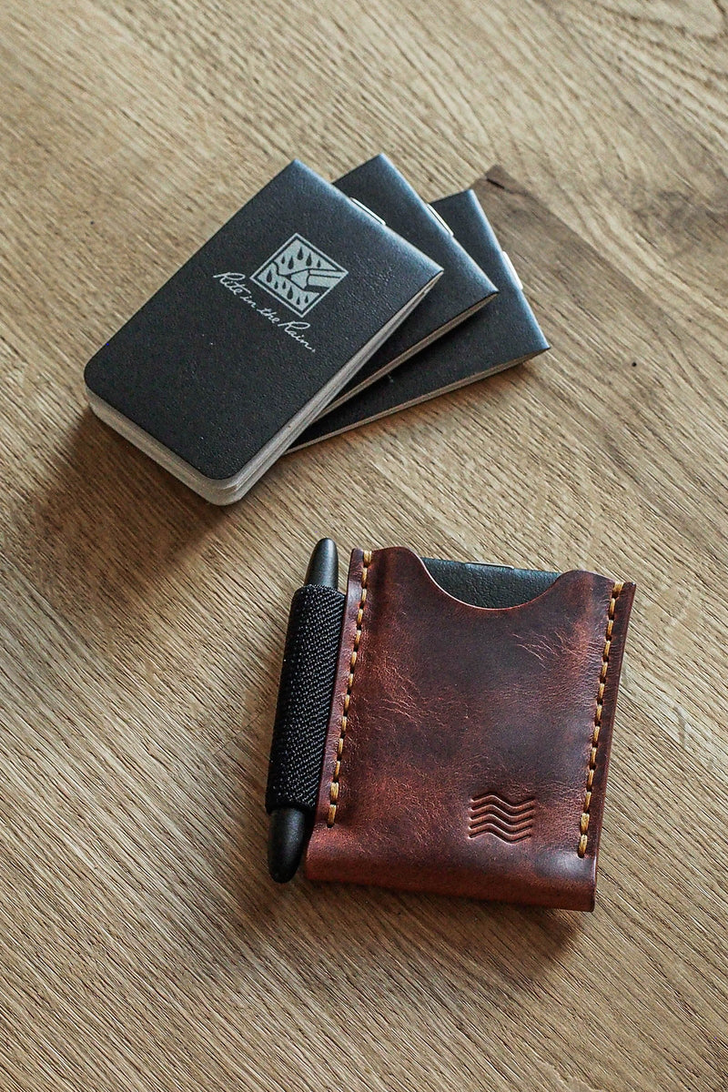 Freddy OTG Organiser is designed specifically for Rite in the Rain On-The-Go Notebooks, you can fit two of those inside. It happens to work great with credit cards as well. Elastic loop for a small pen such as Fisher Space Bullet Pen. The organizer is hand-made in Finland by Luava from veg-tanned leather. Stamped with our Wave mark.