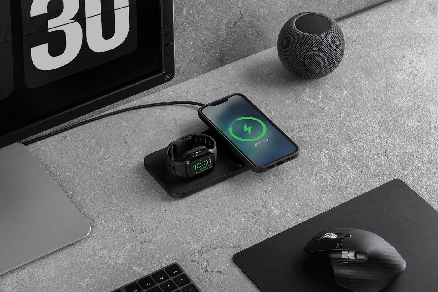 Base One Max delivers official MFi MagSafe charging at up to 15W with a metal body and an elevated glass panel designed to complement any space. Weighing in at almost 1 kg, it stays anchored to its surface when you’re ready to grab your devices and go. An elevated MagSafe charging puck allows you to wrap your fingers around your device for easy pickup. The integrated Apple Watch charger features a protective soft touch charging base.
