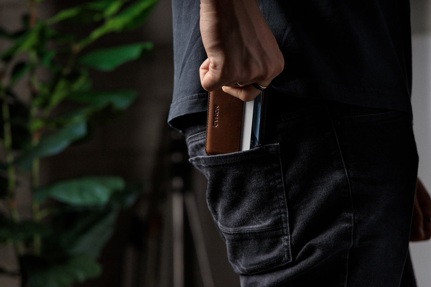 With three external card slots and one large middle cavity, Card Wallet can easily store 10 cards for daily use. Two die-cut pockets eliminate any overlapping leather to reduce thickness while the opposite side features a quick access pocket to easily grab your most used card.