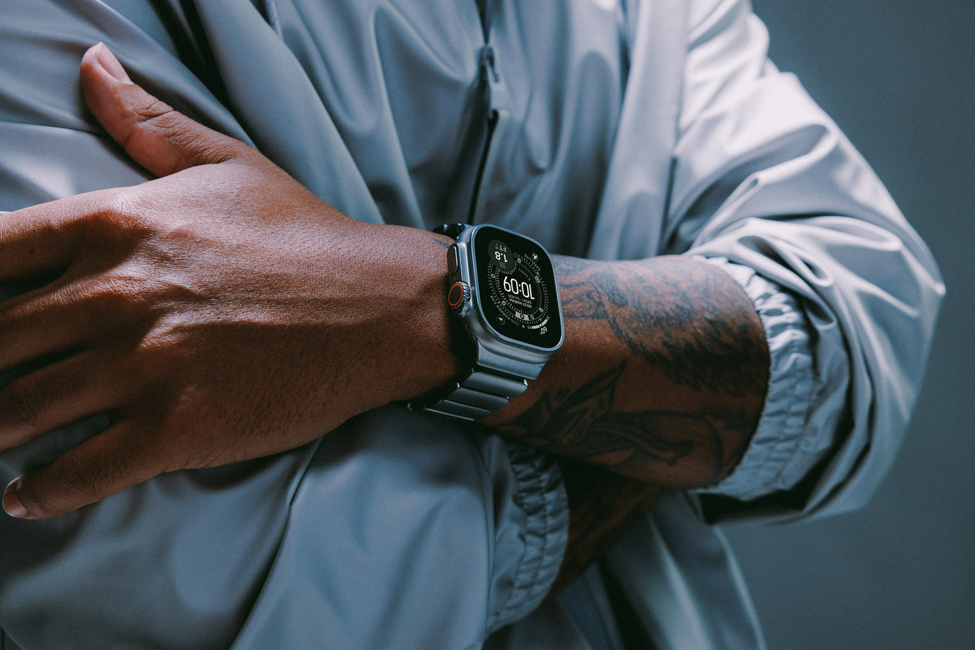 Built from the ground up for Apple Watch Ultra, Stratos Band takes cues from the watch itself. Rounded titanium links and a matte finish blend seamlessly with the Ultra’s titanium case.