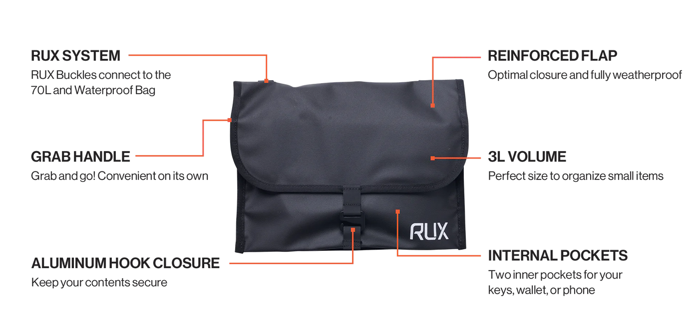 Weather-resistant 3L pocket to conveniently organize small items. Connect it to your RUX 70L or Waterproof Bag, or grab it on its own and go. Super convenient for everyday carry or travel.