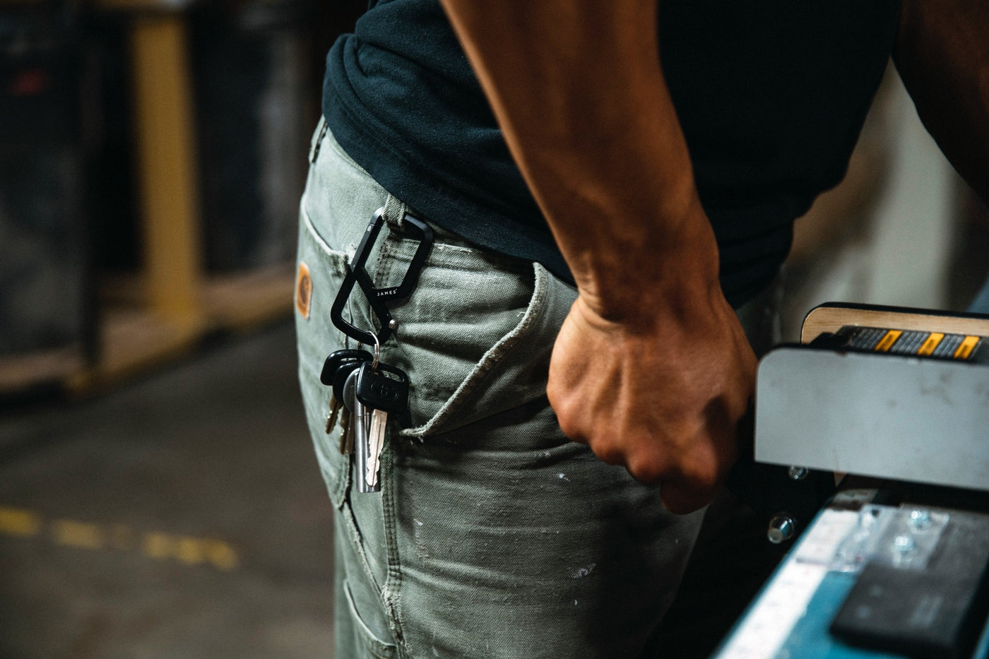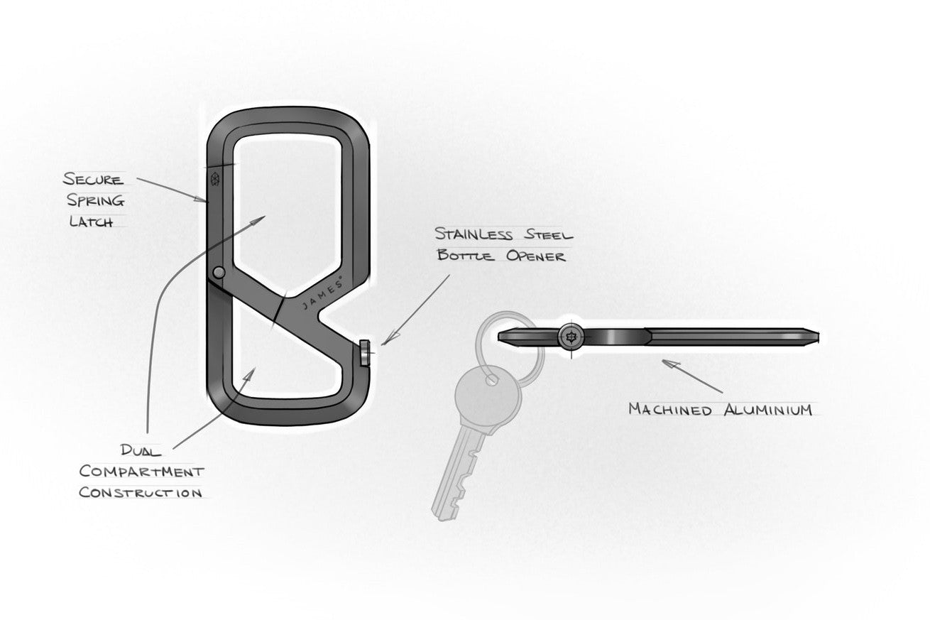 Mehlville carabiner is machined from a single block of aluminum, which creates lightweight, sleek yet strong construction. It has two separate compartments: the wide opening at the top leaves plenty of room to accommodate latching onto everything, while your keys are safely tucked away and won't fall out when you unlatch the top. The custom thumb stud bottle opener takes care of the cap of your favourite beverate any time.