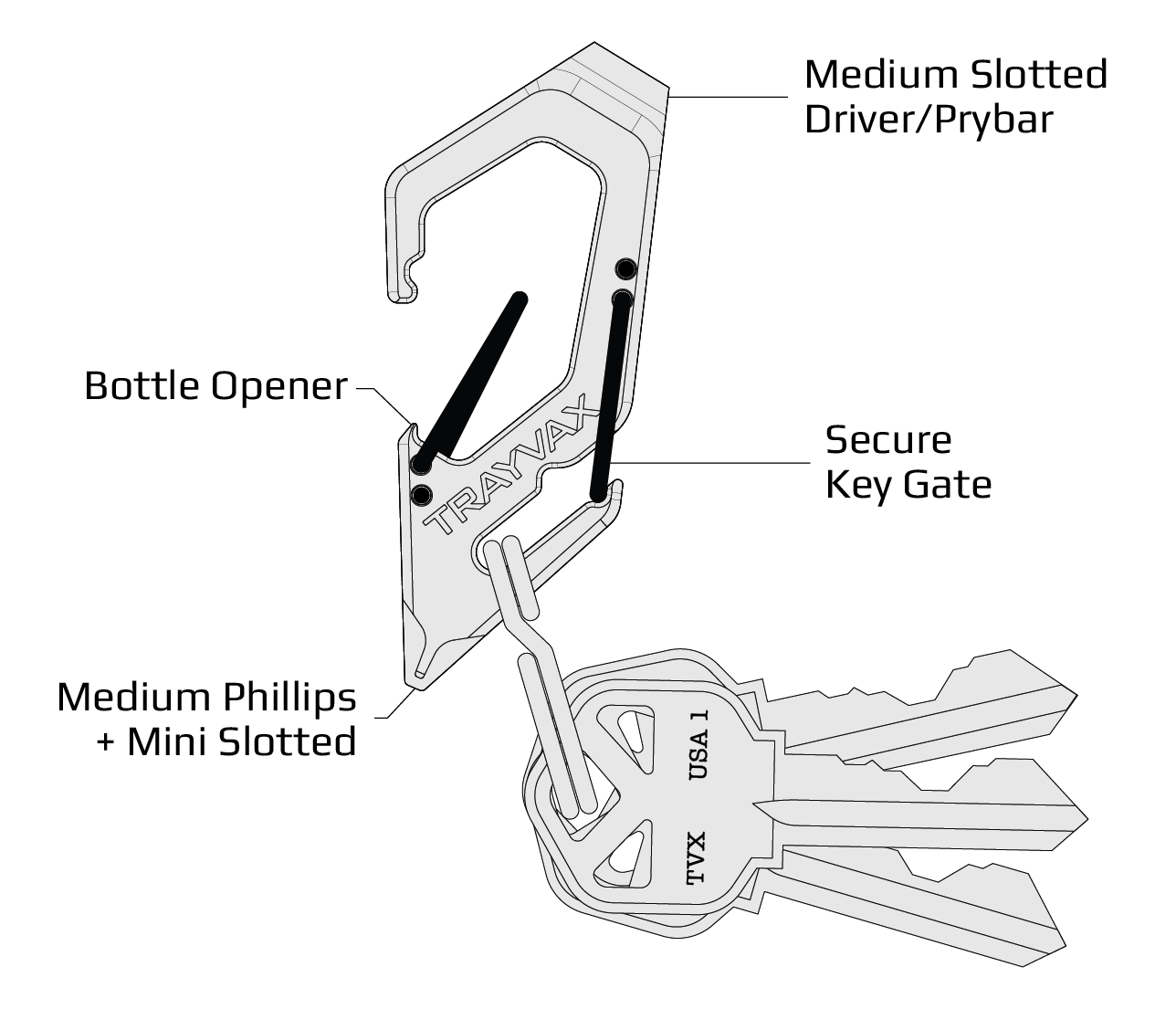 The carabiner’s ergonomic shape provides secure grip for maximum torque despite its size, and its dual gate layout keeps your keys securely attached during carry, while allowing convenient detachment for unencumbered use.
